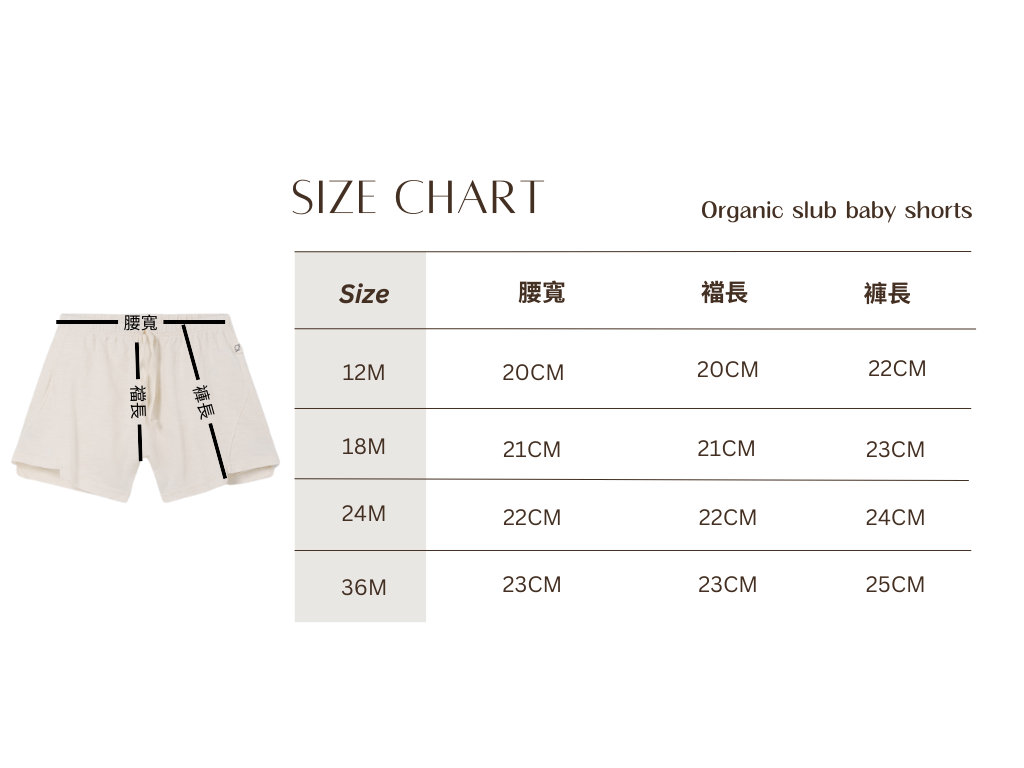 短褲採用有機棉製成,親膚透氣適合漸熱的春夏穿著,綁帶調整設計,更符合寶寶身形