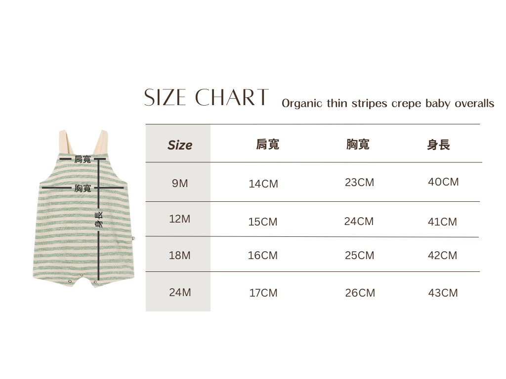 連身褲選用雲朵般柔軟有機棉布料,背後彈性鬆緊設計及褲襠開扣,穿著更容易舒適,條紋及吊帶點綴充分展現可可愛愛